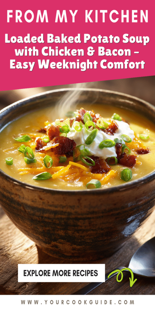 Enjoy your homemade Loaded Baked Potato Soup with Chicken & Bacon – Easy Weeknight Comfort Recipe!
